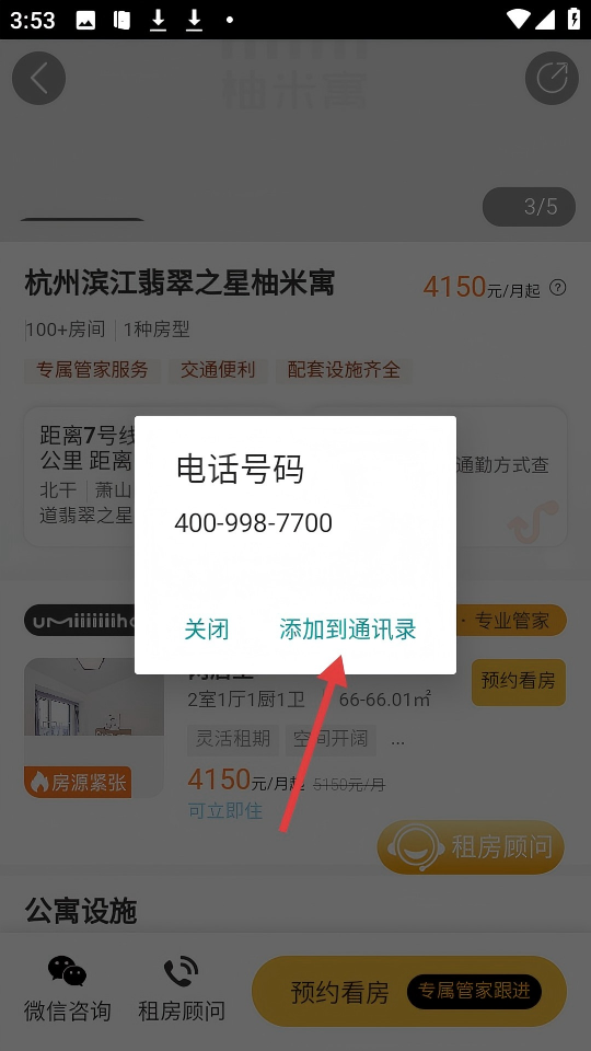 4、點擊【租房顧問】后可將電話號碼【400-998-7700】添加到通訊錄。
