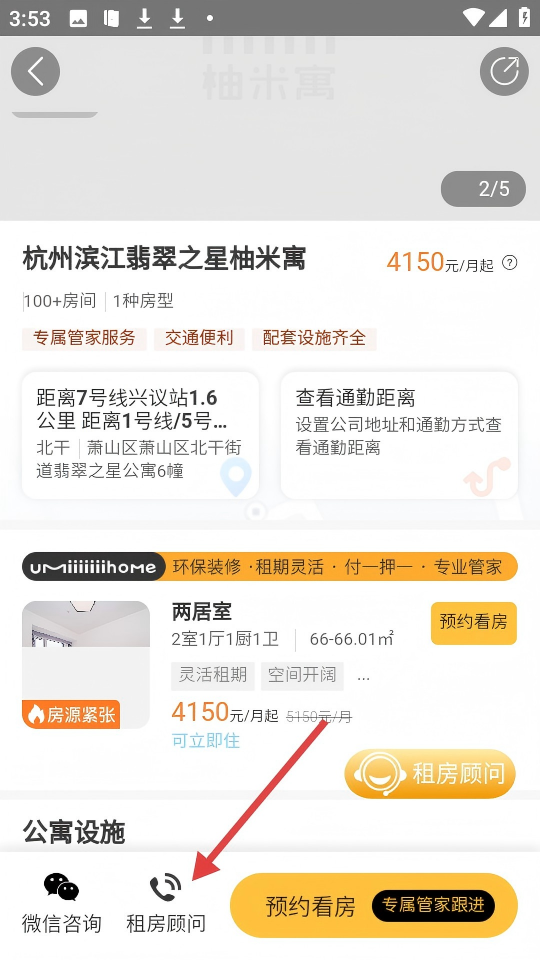 3、在【杭州濱江翡翠之星柚米寓】詳情頁點擊【租房顧問】獲取房源信息。