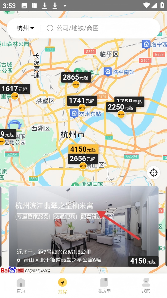 2、利用地圖功能找到【杭州濱江翡翠之星柚米寓】房源。