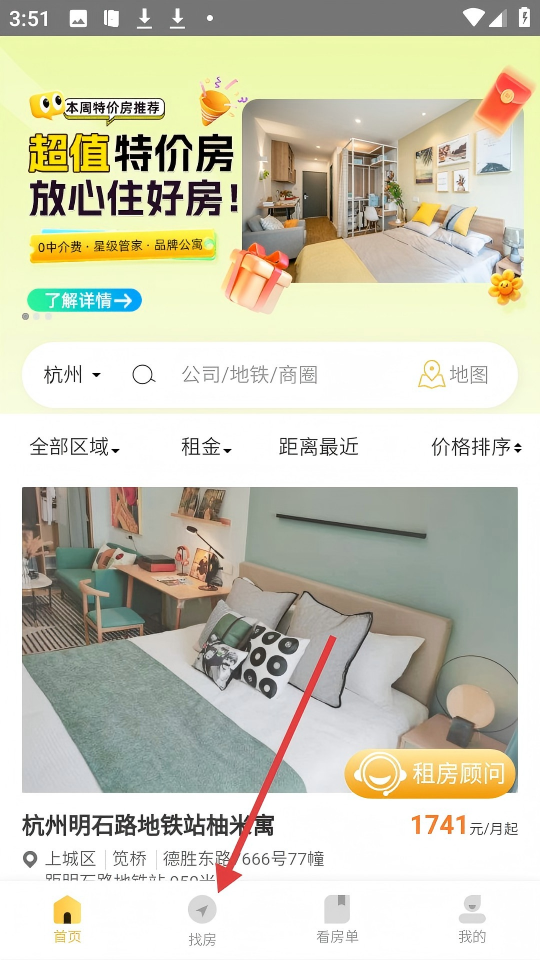 1、點擊底部【找房】按鈕,可篩選杭州區(qū)域的房源。