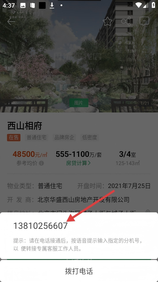 4、點擊【電話咨詢】后,可獲取樓盤咨詢電話,按提示操作可轉(zhuǎn)接專屬客服。