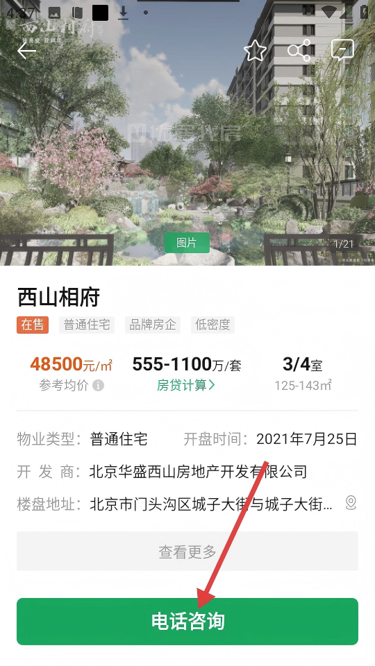 3、進(jìn)入【西山相府】詳情頁后,可查看樓盤詳細(xì)信息,若有咨詢需求,可點擊【電話咨詢】按鈕。