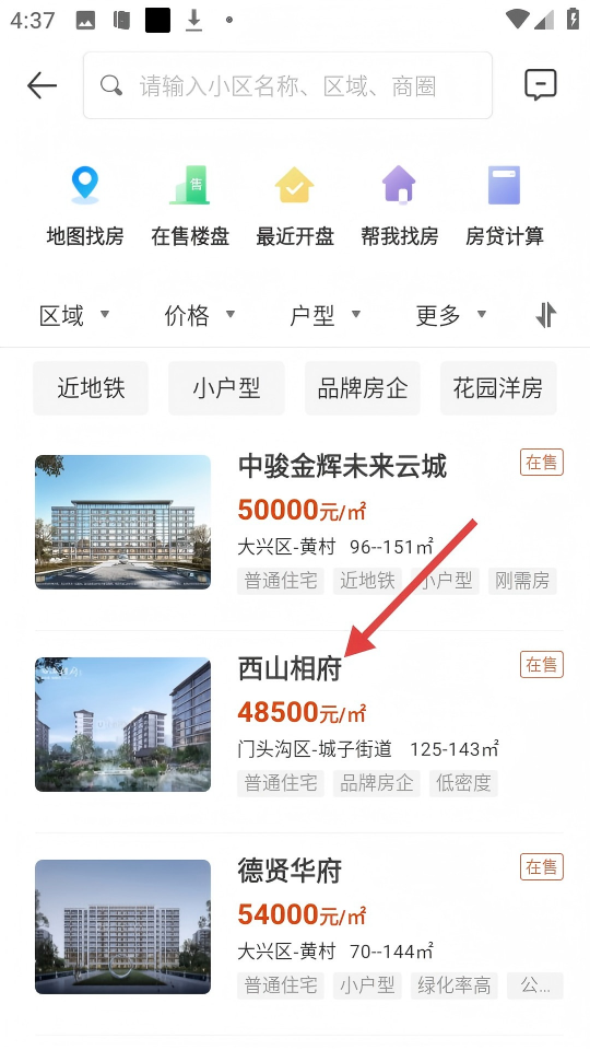 2、利用區(qū)域、價格、戶型等篩選條件,還可借助近地鐵、小戶型等標(biāo)簽,快速找到像【西山相府】這樣的目標(biāo)樓盤。