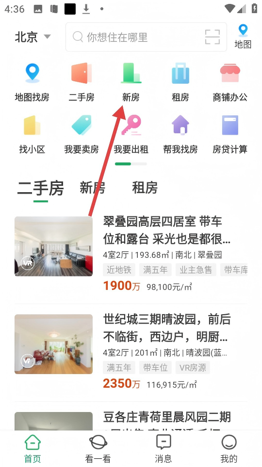1、在應(yīng)用首頁,可點擊【新房】入口,切換到新房板塊查找房源。