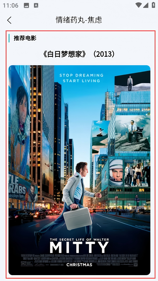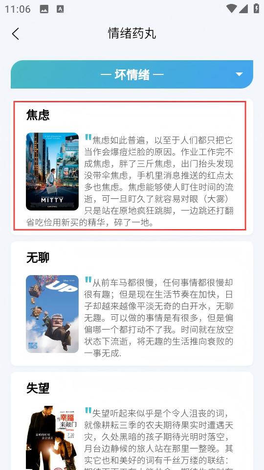 3、在情緒藥丸頁面點(diǎn)擊【焦慮】分類,可查看該情緒對應(yīng)的電影推薦及介紹內(nèi)容。