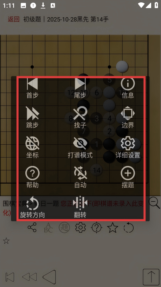 4、在圍棋題目界面,可利用【首步】【尾步】等功能輔助解題,還可通過【信息】【邊界】【詳細(xì)設(shè)置】等進(jìn)行界面調(diào)整。
