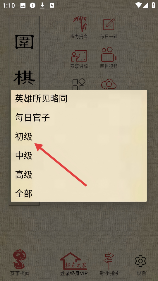 2、在【每日一題】的選項(xiàng)中,點(diǎn)擊【初級(jí)】可進(jìn)入初級(jí)難度的圍棋題目。