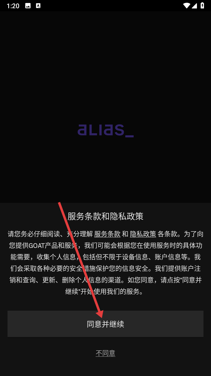 1、進(jìn)入應(yīng)用后,閱讀【服務(wù)條款】和【隱私政策】,點(diǎn)擊【同意并繼續(xù)】,方可繼續(xù)使用應(yīng)用功能。