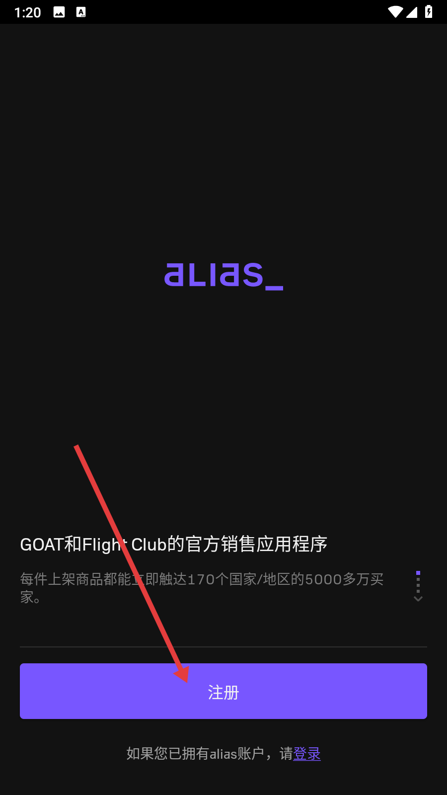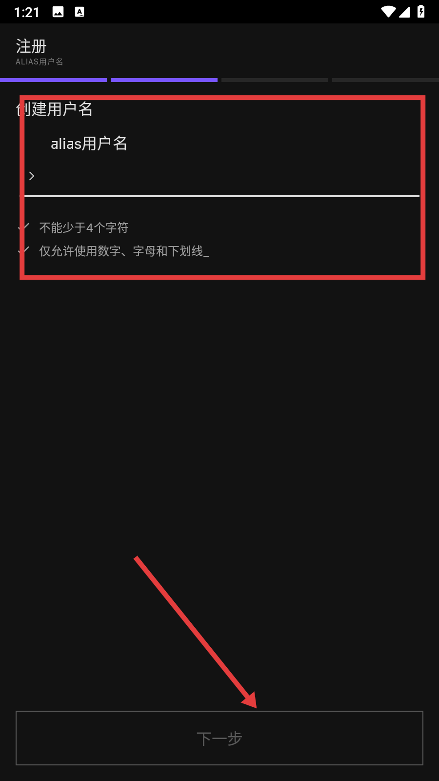 4、在創(chuàng)建用戶名頁面,輸入符合要求的【alias用戶名】,點(diǎn)擊【下一步】完成注冊(cè)步驟。