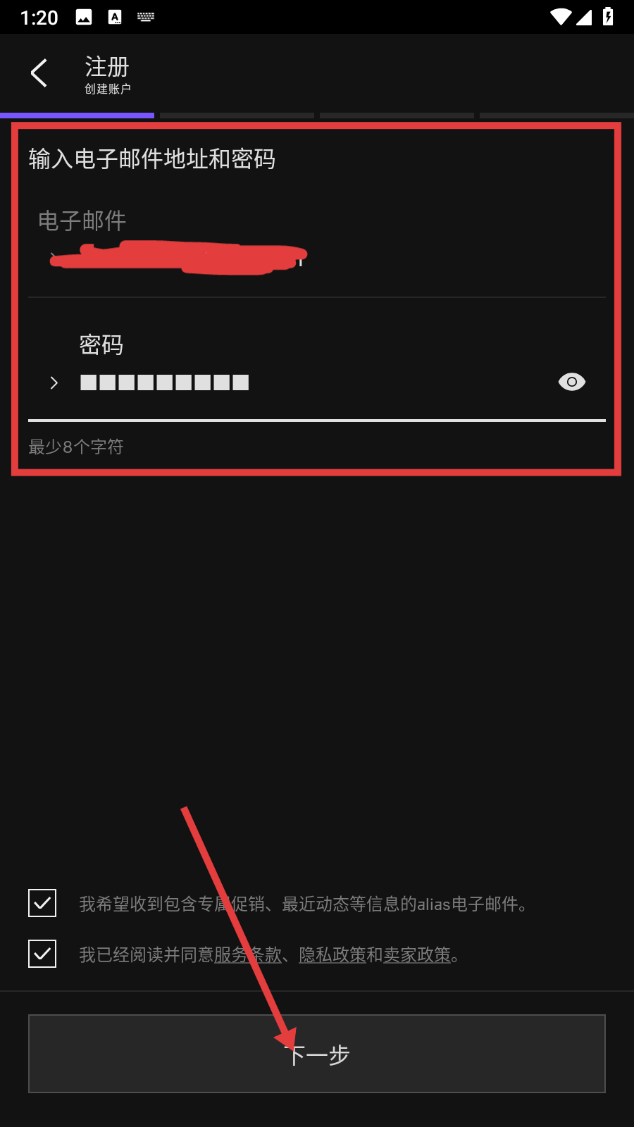 3、在注冊(cè)頁面,輸入【電子郵件】地址和密碼,勾選相關(guān)協(xié)議后點(diǎn)擊【下一步】。
