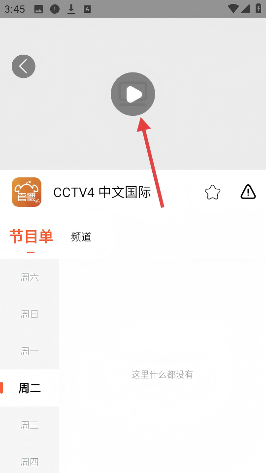 4、進(jìn)入【CCTV4中文國際】頁面,點(diǎn)擊播放按鈕可嘗試觀看,同時(shí)可查看節(jié)目單。