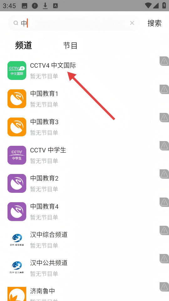 3、在頻道列表中找到【CCTV4中文國際】,可查看該頻道相關(guān)信息。