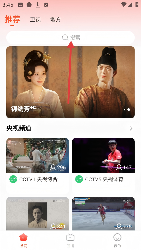1、在首頁點(diǎn)擊【搜索】欄,可輸入內(nèi)容查找頻道或節(jié)目。