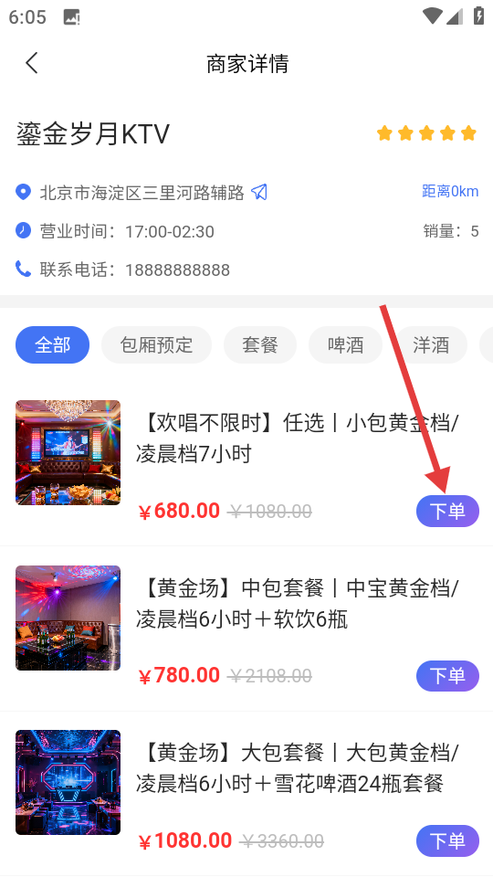 3、在商家詳情頁(yè),選擇心儀的套餐,點(diǎn)擊【下單】,進(jìn)入商品詳情頁(yè)。