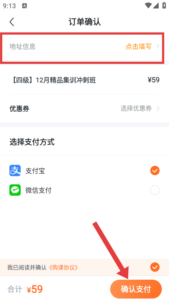 4、在訂單確認(rèn)頁填寫地址信息,選擇支付方式后點(diǎn)擊【確認(rèn)支付】完成購課。