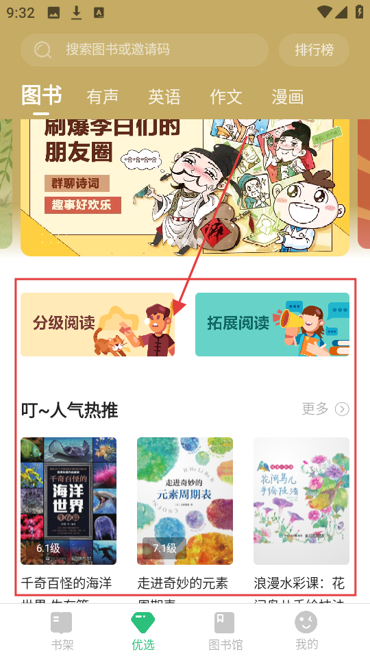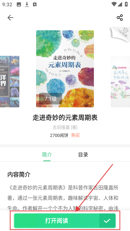 1、在軟件優(yōu)選頁(yè)面,有人氣熱推圖書如【走進(jìn)奇妙的元素周期表】,點(diǎn)擊它可進(jìn)入圖書詳情頁(yè),了解圖書信息哦。