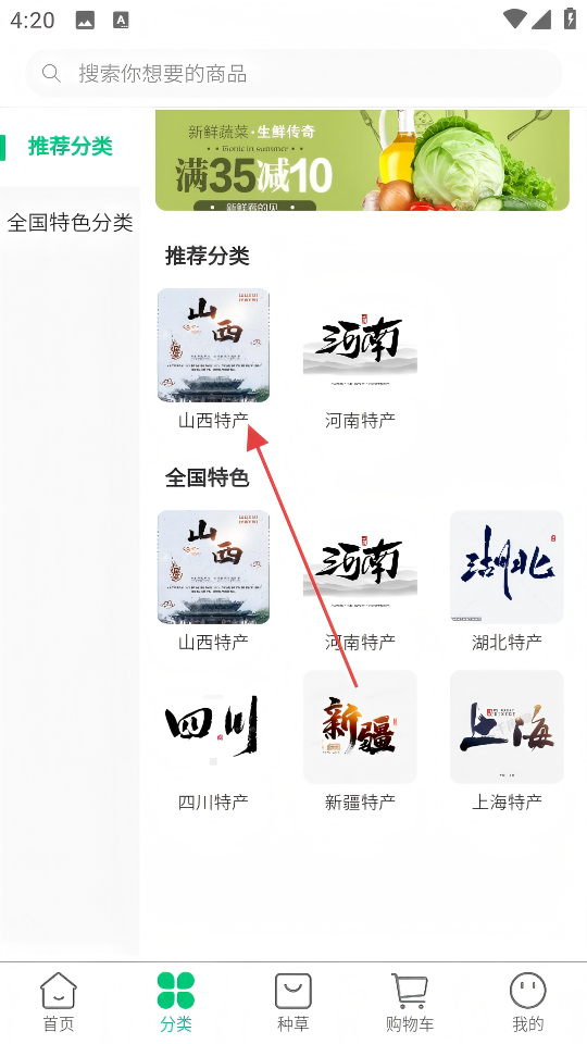 2、在分類頁面,選擇【山西特產(chǎn)】分類,進(jìn)入山西特產(chǎn)商品列表頁面。