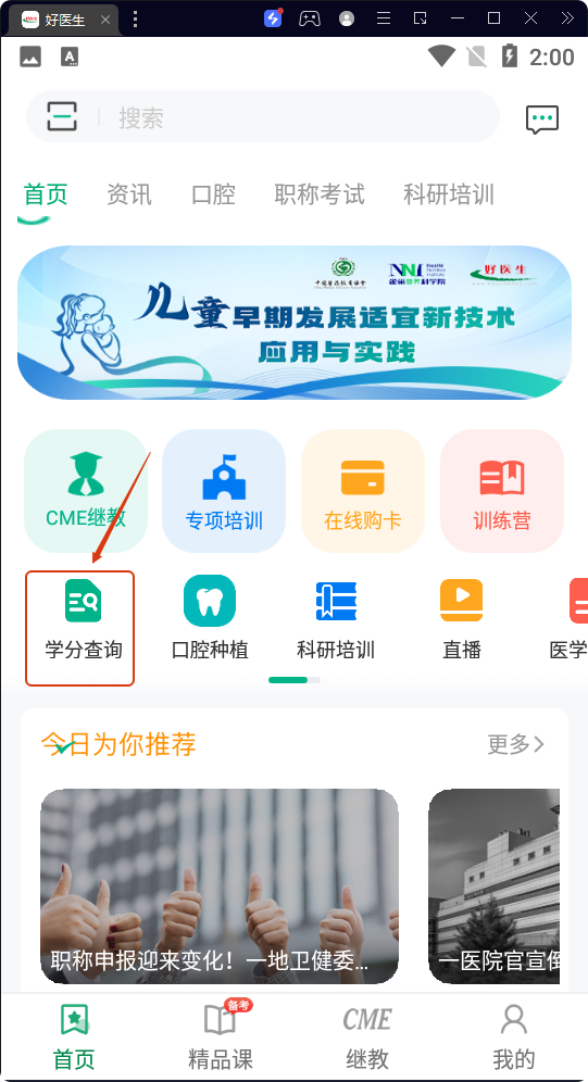 1、在興趣推薦頁(yè)面點(diǎn)擊【下一步】,進(jìn)入應(yīng)用首頁(yè),可查看CME繼教、學(xué)分查詢等功能入口。