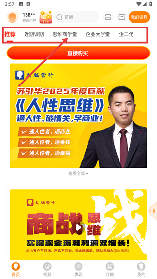 1、打開(kāi)APP首頁(yè),點(diǎn)擊【思維商學(xué)堂】標(biāo)簽。