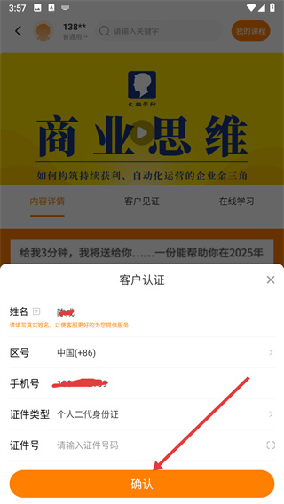 4、在認(rèn)證彈窗中,填寫(xiě)姓名、手機(jī)號(hào)、證件號(hào)等信息后點(diǎn)擊【確認(rèn)】,完成課程報(bào)名流程。