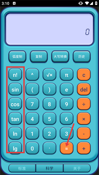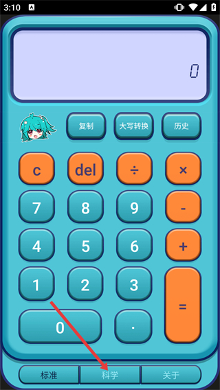 2、在計(jì)算器的標(biāo)準(zhǔn)界面底部,點(diǎn)擊【科學(xué)】選項(xiàng),切換至包含三角函數(shù)、對(duì)數(shù)等功能的科學(xué)計(jì)算界面。