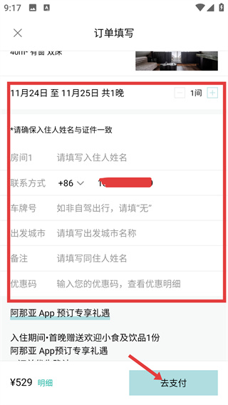 4、在訂單填寫頁面完善【入住人姓名】【聯(lián)系方式】等信息后,點擊【去支付】,完成酒店預訂流程。
