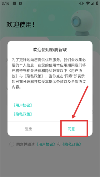 1、在影騰智聯(lián)的歡迎提示彈窗中,閱讀《用戶(hù)協(xié)議》與《隱私政策》后,點(diǎn)擊【同意】按鈕,進(jìn)入應(yīng)用的登錄界面。