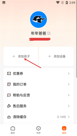 2、進(jìn)入【我的】頁面后,找到并點(diǎn)擊【添加孩子】按鈕,即可進(jìn)入【完善孩子信息】的編輯頁面。