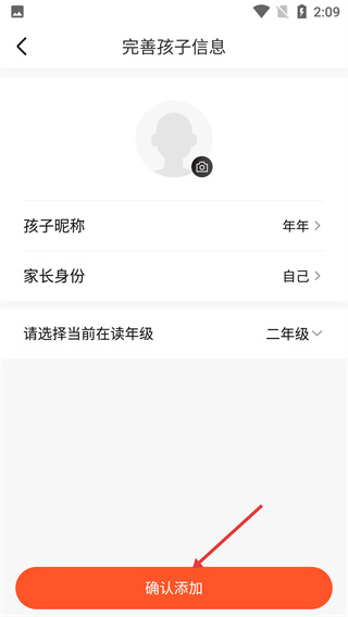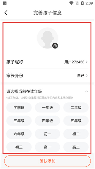 4、確認(rèn)【孩子昵稱】、【家長身份】、【在讀年級(jí)】信息無誤后,點(diǎn)擊【確認(rèn)添加】按鈕,完成孩子信息的添加操作。