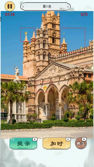 1、進(jìn)入第1關(guān),仔細(xì)觀察建筑圖片,尋找指定的目標(biāo)元素,可借助【提示】功能輔助查找。