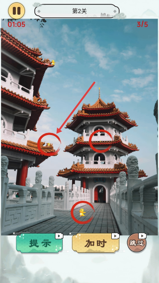 4、第2關(guān)需觀察中式建筑圖片,快速找出指定的目標(biāo)元素,注意把握時(shí)間,可利用【加時(shí)】功能延長(zhǎng)時(shí)間。