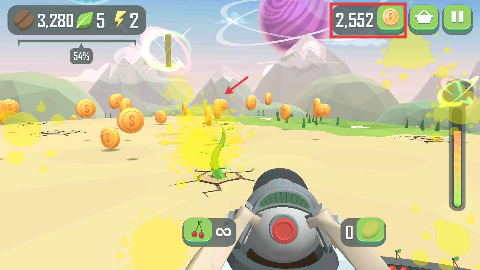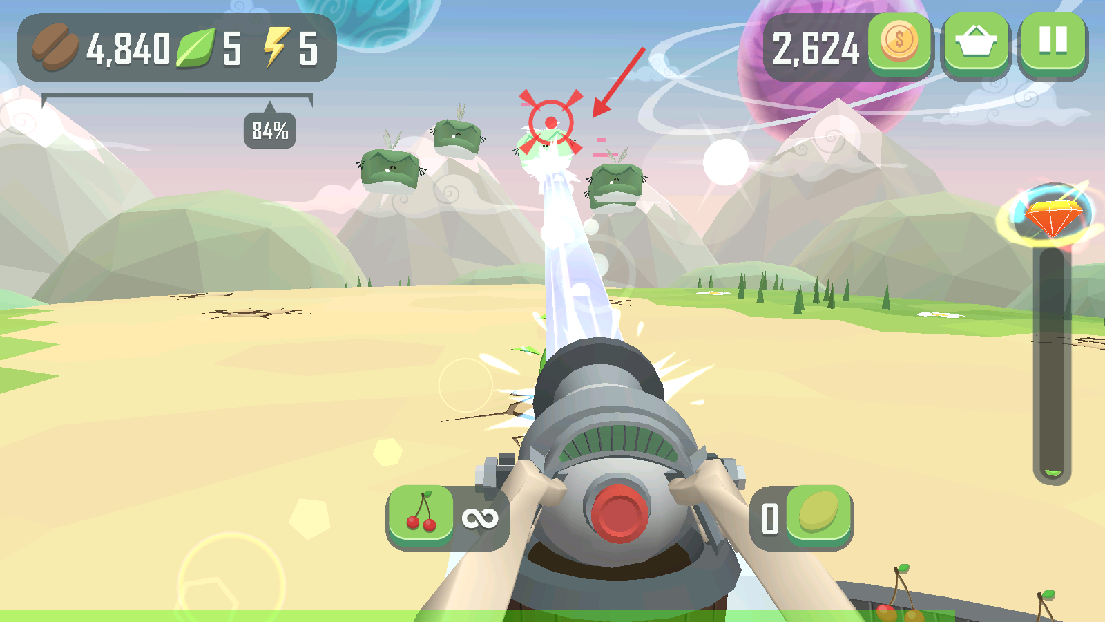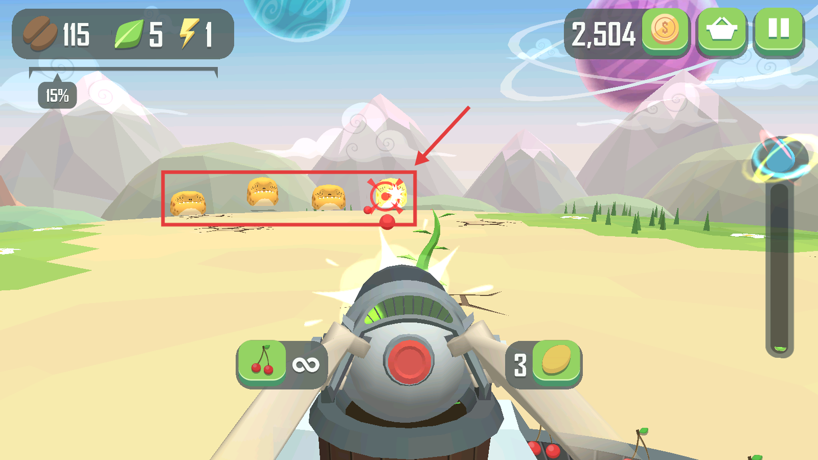 1、我們瞄準(zhǔn)前方黃色的怪物射擊,利用【櫻桃】彈藥,搭配右側(cè)的彈藥,精準(zhǔn)打擊能推進進度哦。