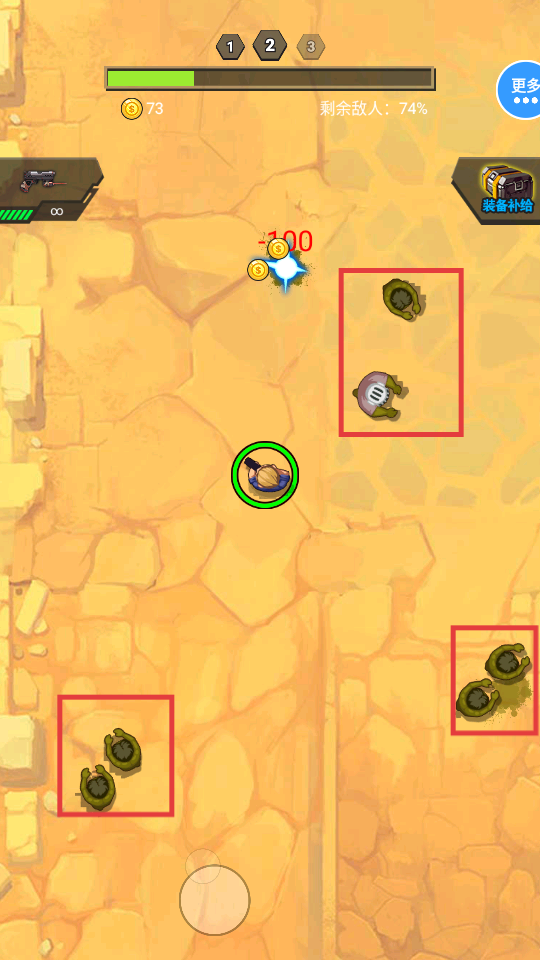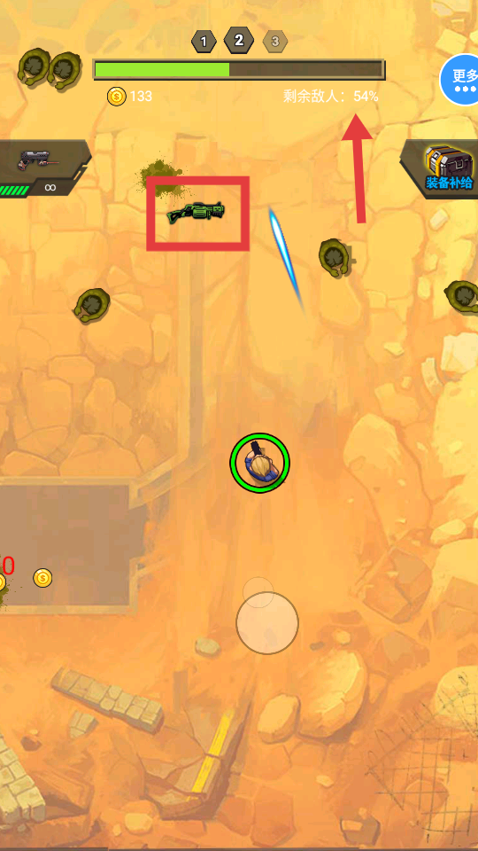 2、游戲開(kāi)始后,操控角色移動(dòng),優(yōu)先攻擊紅框內(nèi)的敵人,獲取金幣和道具。