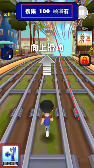 2、接著依據(jù)提示【向上滑動】,同時推進【搜集100顆鑽石】的任務(wù),使角色向上行動并收集鉆石。