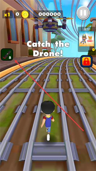3、當出現(xiàn)【Catch-the-Drone!】提示時,點擊左側(cè)的滑板道具,幫助角色去捕捉無人機。