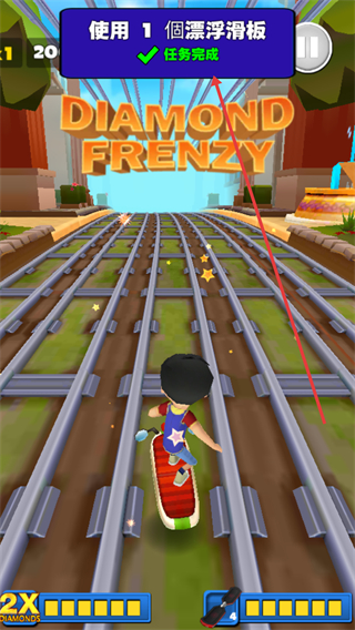 4、使用滑板后,完成【使用1個漂浮滑板】的任務(wù),角色會借助滑板在軌道上繼續(xù)前進,獲取更多鉆石。