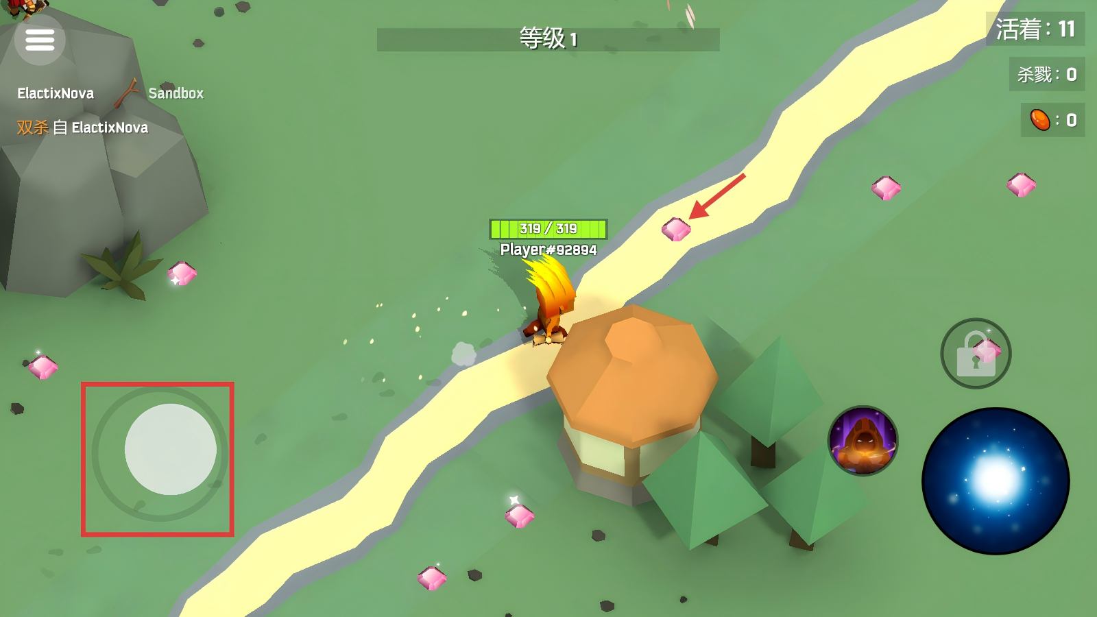 1、進(jìn)入游戲后,操控左側(cè)搖桿移動角色,沿著路徑去收集【粉色寶石】,積攢資源為后續(xù)戰(zhàn)斗做準(zhǔn)備。