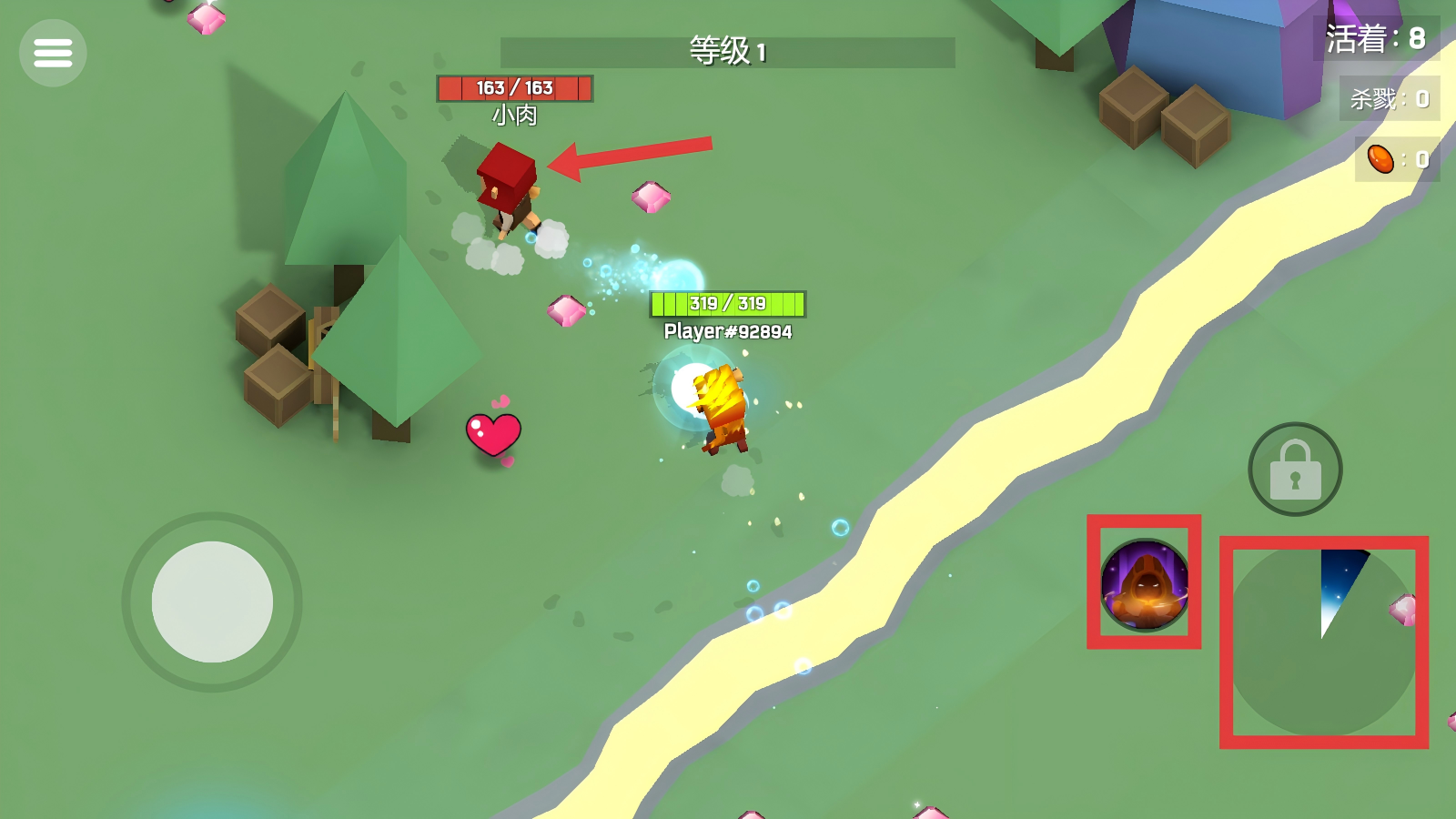 2、遇到名為【小肉】的敵人時,點擊右側(cè)技能按鍵發(fā)起攻擊,擊敗它可獲得成長機會,注意躲避敵人的反擊。