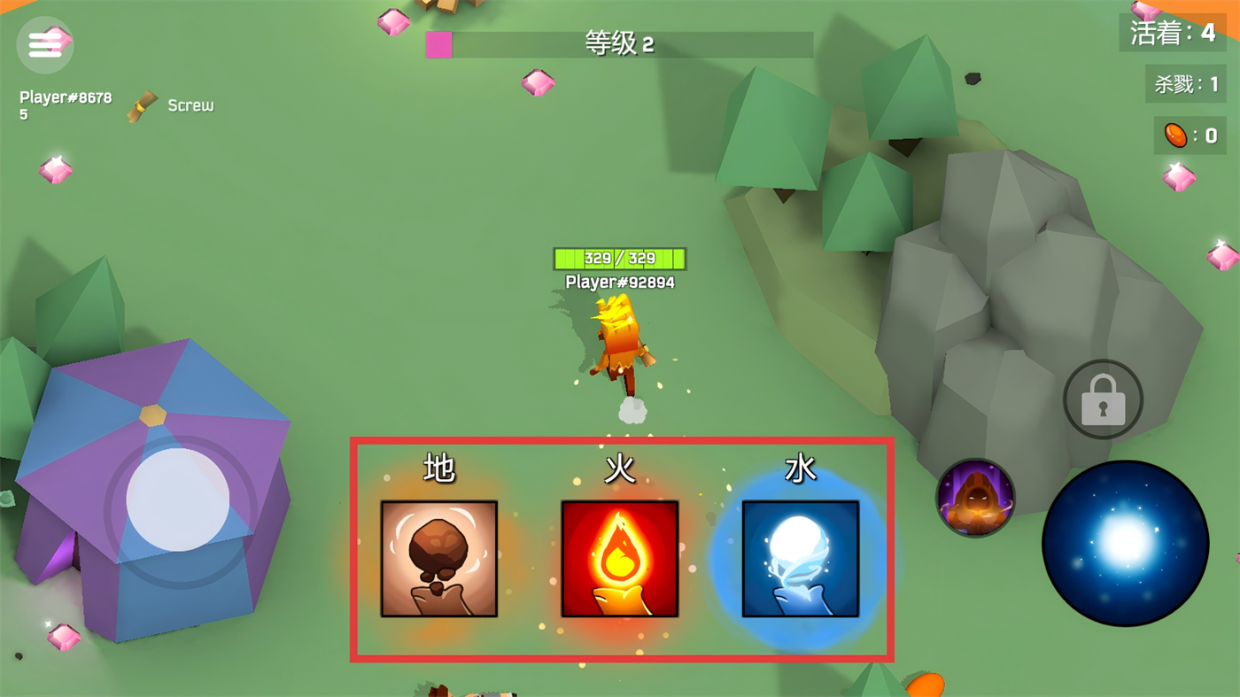 3、升級到等級2后,可選擇【地】、【火】、【水】三種元素技能,根據(jù)戰(zhàn)斗需求挑選合適的元素魔法,強化戰(zhàn)斗能力。