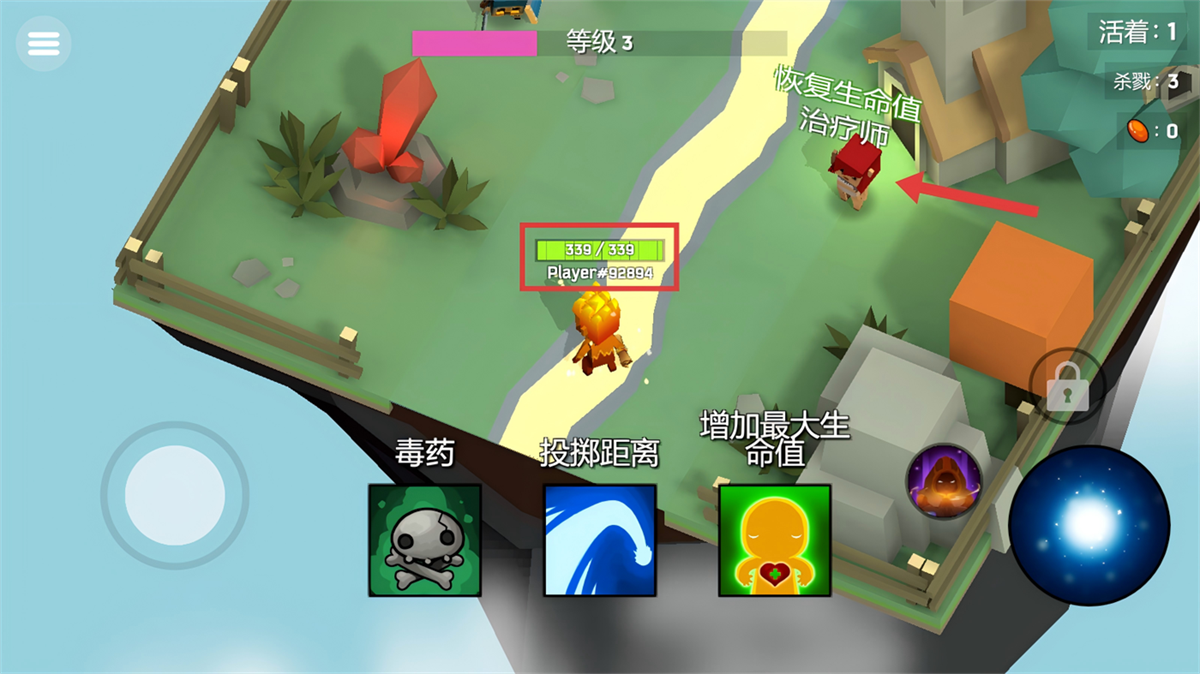 4、達(dá)到等級3時,若生命值不足,可前往【治療師】處恢復(fù)生命值,還能選擇【毒藥】、【投擲距離】、【增加最大生命值】等技能強化自身。