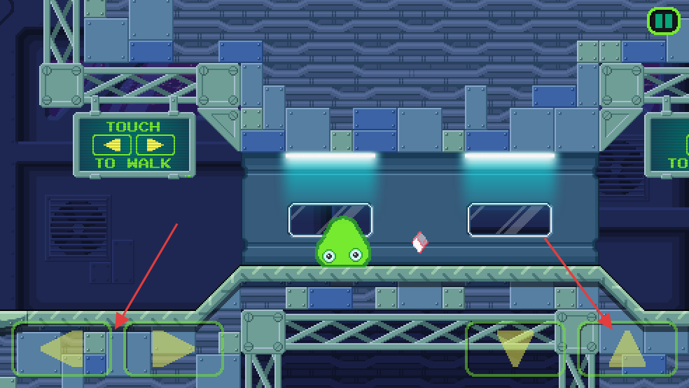 2、進(jìn)入關(guān)卡后,根據(jù)提示,通過點擊左右方向箭頭按鈕,操控綠色小怪物在場景中行走,探索路徑。