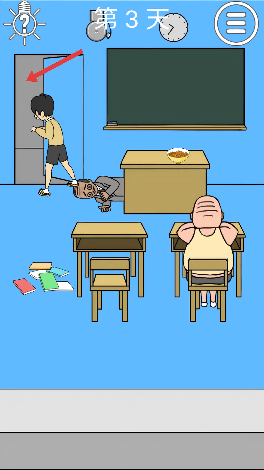 3、趁老師被干擾倒地時,趕緊點擊門口區(qū)域,悄悄溜出去,別被發(fā)現(xiàn)啦。