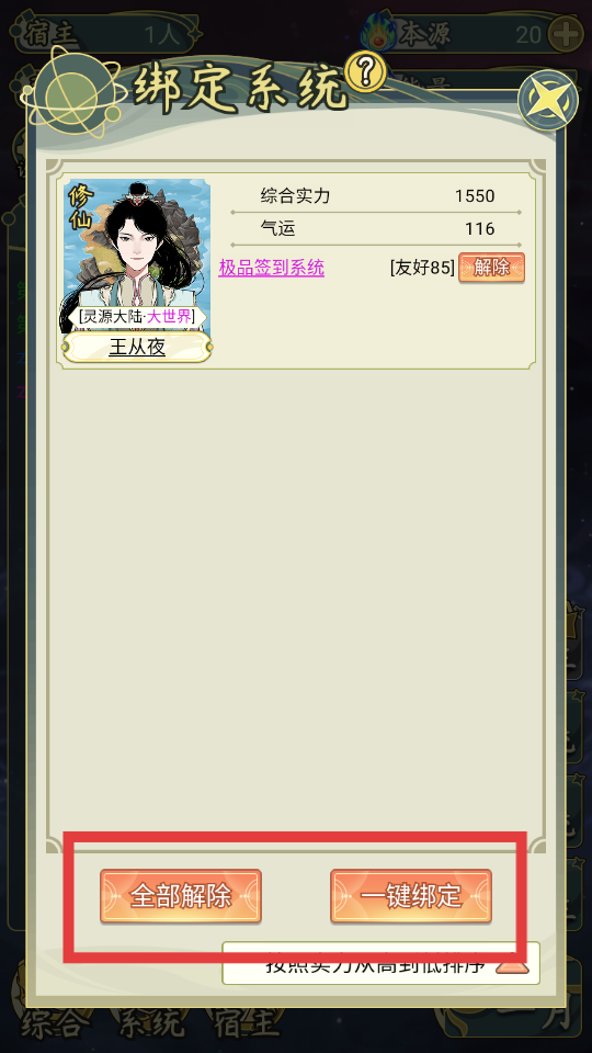 1、在【綁定系統(tǒng)】界面,可通過(guò)【全部解除】或【一鍵綁定】調(diào)整與宿主的系統(tǒng)綁定關(guān)系,優(yōu)化系統(tǒng)配置。