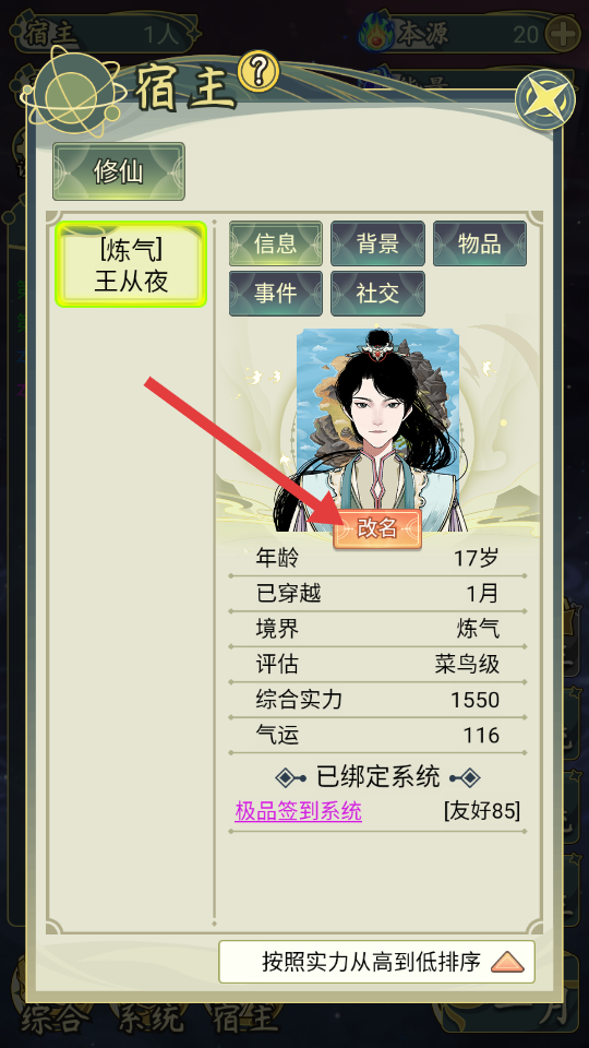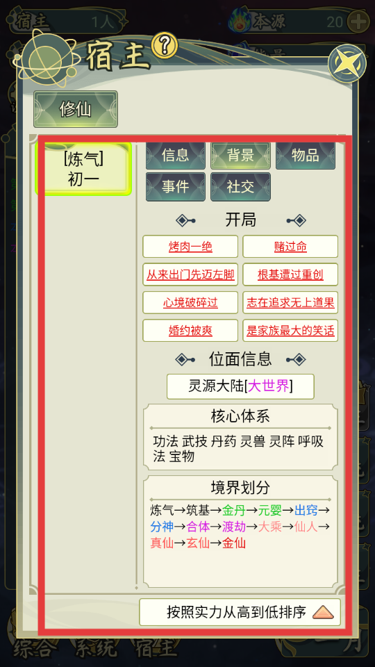 3、在【宿主】界面查看開(kāi)局、位面信息等內(nèi)容,了解宿主的背景和所處世界的體系,為發(fā)展制定策略。