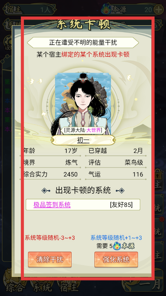 4、遇到【系統(tǒng)卡頓】時(shí),可選擇【清除干擾】或消耗本源【強(qiáng)化系統(tǒng)】,解決系統(tǒng)問(wèn)題,利用不減反增優(yōu)勢(shì)快速發(fā)展。