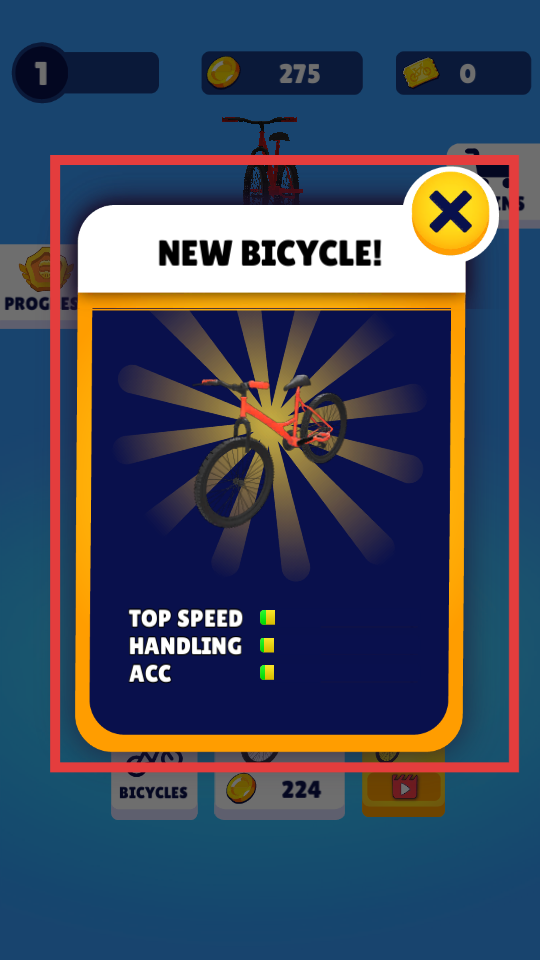 4、解鎖新自行車如【NEWBICYCLE!】,提升【TOPSPEED】【HANDLING】【ACC】等屬性,增強(qiáng)騎行能力,在比賽中更具優(yōu)勢(shì)。