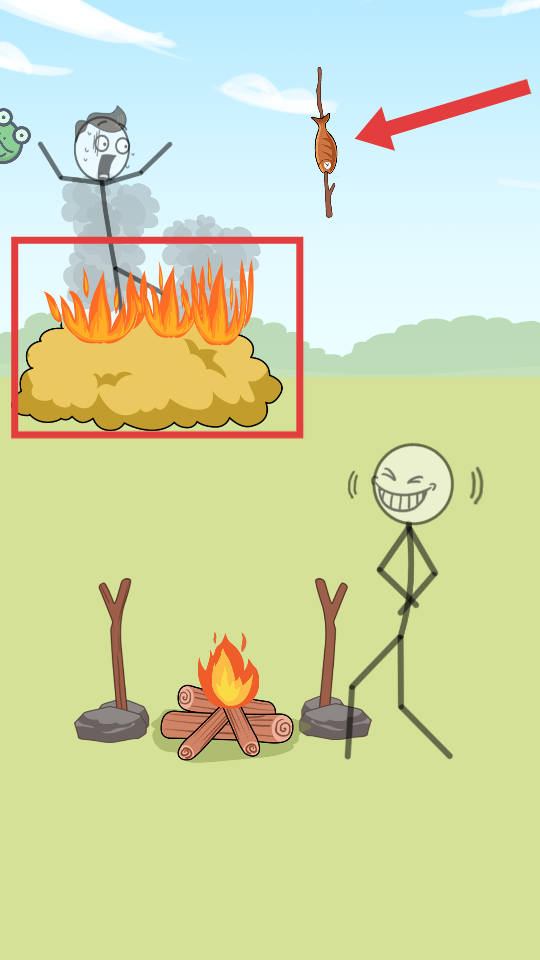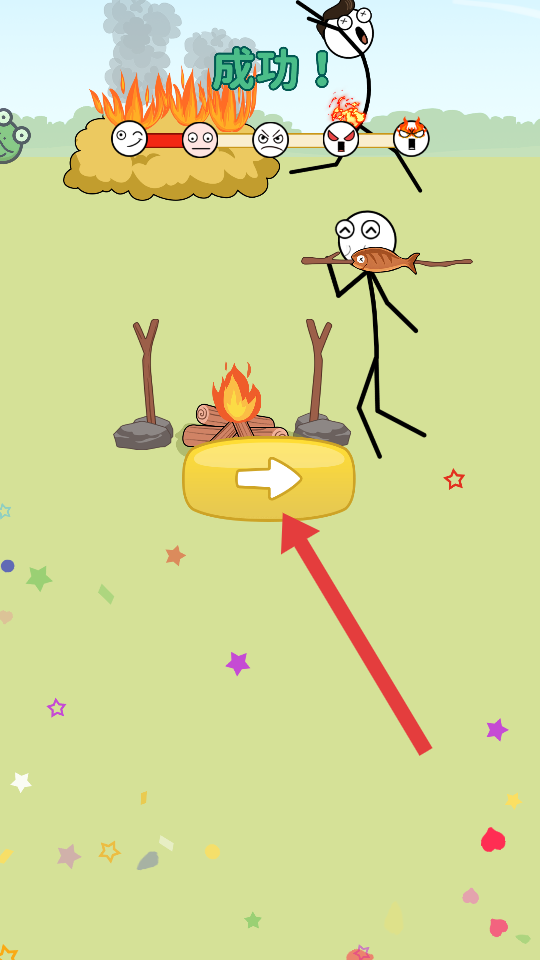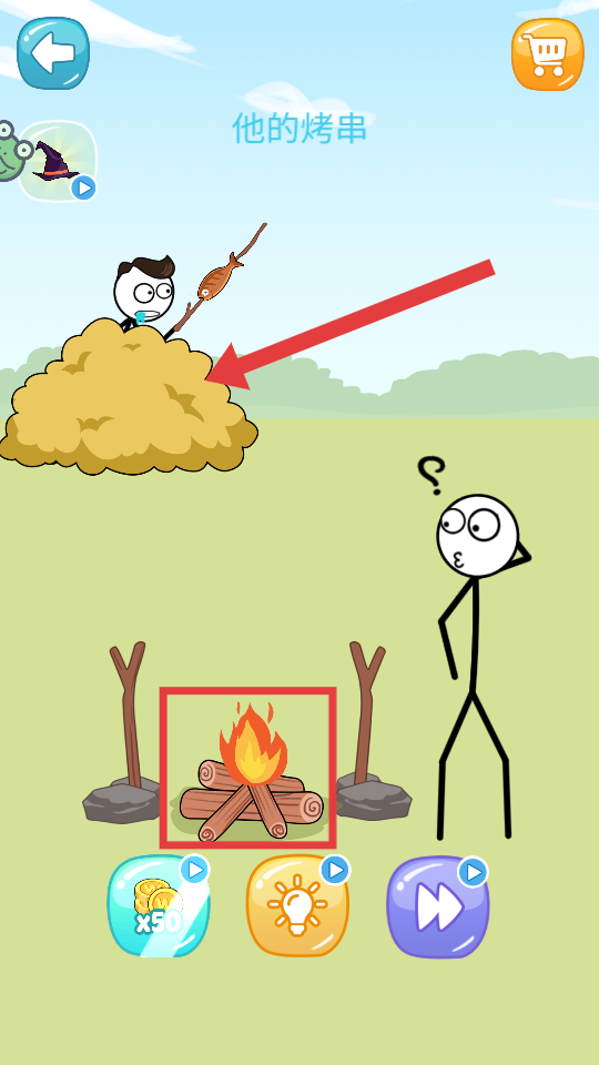 3、點燃草堆后,烤串將會被扔到空中,點擊箭頭所指【烤串】將其拿回即可通關(guān)。