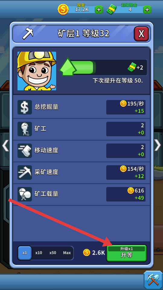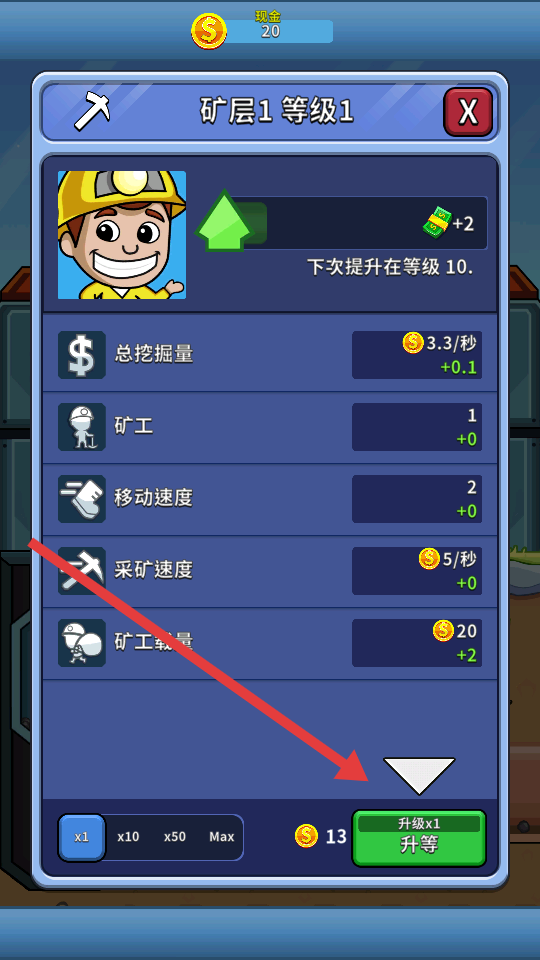 3、升級機(jī)制很直觀,金幣足夠就能升級礦工、電梯、運(yùn)輸工,升級后收益和效率會明顯提升,能清晰看到自己的經(jīng)營成果。