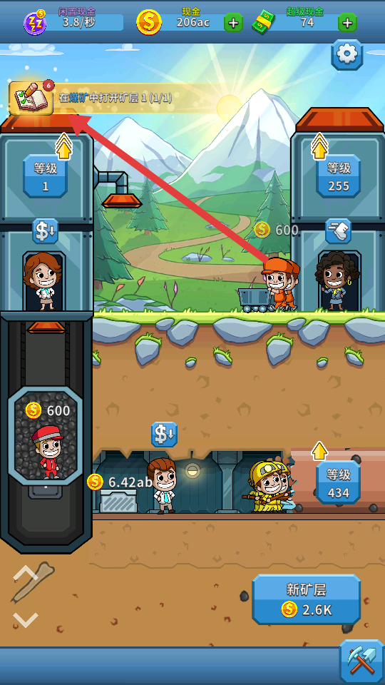 3、完成任務(wù)如【在煤礦中打開礦層1】,獲取獎(jiǎng)勵(lì),解鎖新礦層和礦工,擴(kuò)大采礦規(guī)模。