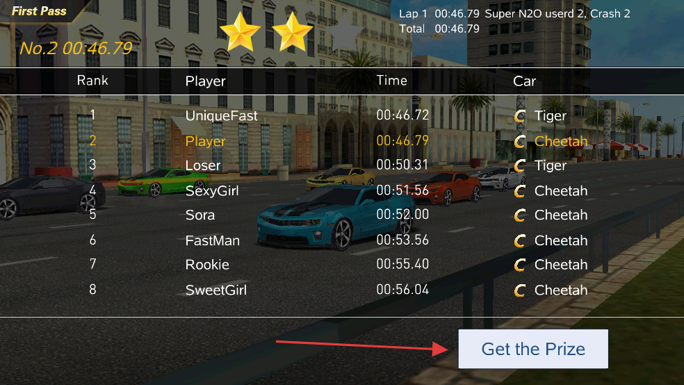 4、比賽結(jié)束后,點(diǎn)擊【Get-the-Prize】按鈕領(lǐng)取獎(jiǎng)勵(lì),繼續(xù)參與競(jìng)速,不斷提升駕駛技巧和賽車性能。